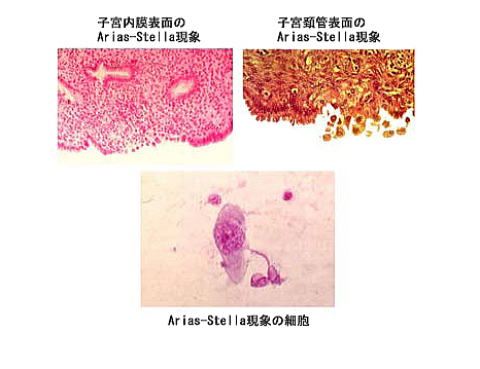 子宮外妊娠や流産などで子宮の内膜に起こる変化の一つです。顕微鏡で細胞を見ると子宮内膜の腺管に妊娠による変化が認められます。核がゴツゴツしながらやや大きくなり、細胞もふくらんで大きくなります。この子宮内膜の変化をアリアス・ステラ現象といいます。